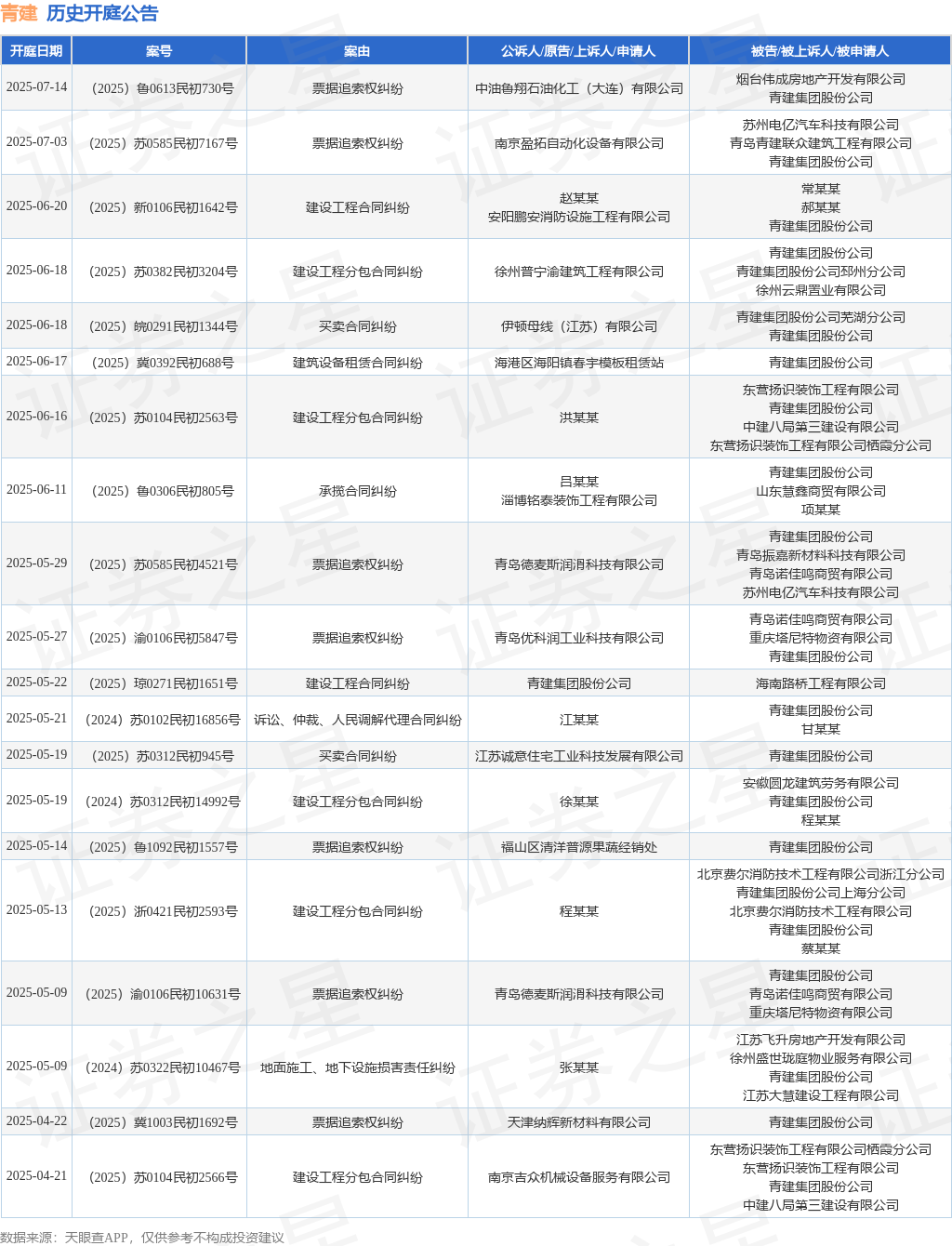 本站消息,根据天眼查APP显示,近日公布了一则青建集团股份公司作为被告/被上诉人的开庭公告,详细内容如下: